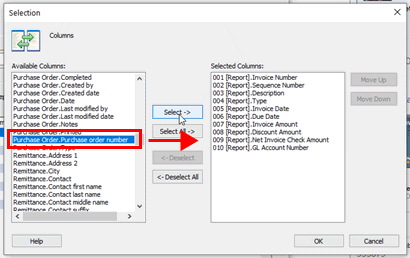 4. Use the Selection window to move Purchase Order.Purchase order number to the Selected Columns list, and then click OK.