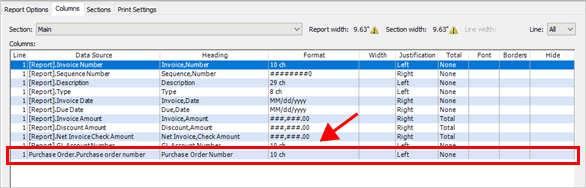 The Purchase Order.Purchase order number displays in the Columns grid.