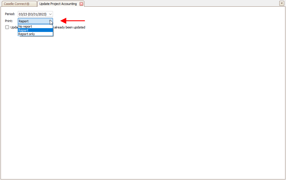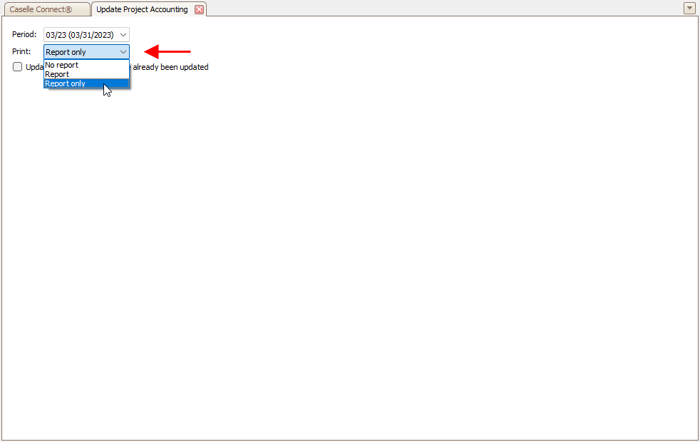 The transactions that will be posted to Project Accounting print on the Update report. None of the transactions are posted to Project Accounting.