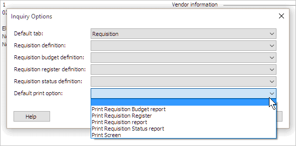 Clicking the Print button in Requisition Inquiry gives you the option of printing the Requisition Report, Requisition Budget Report, Requisition Register, Requisition Status Report, or printing a screen capture. You can choose an option as the default print setting.