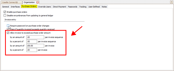 Yes, allow a user to save the invoice. On the Purchase Orders tab, click to select Allow Invoice to Exceed Purchase Order Amount. Then, enter the amount or percent over the PO amount on each individual sequence. Followed by the amount or percent of the PO amount on each invoice.