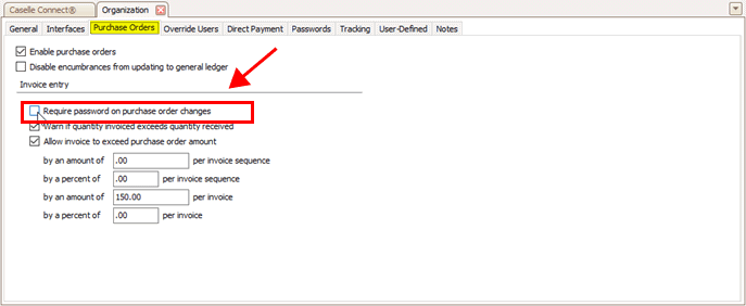 Yes, a user must enter a password to change a purchase order that has been saved. Click to select Require Password on Purchase Order Changes. You may need to restart Caselle to apply your changes.