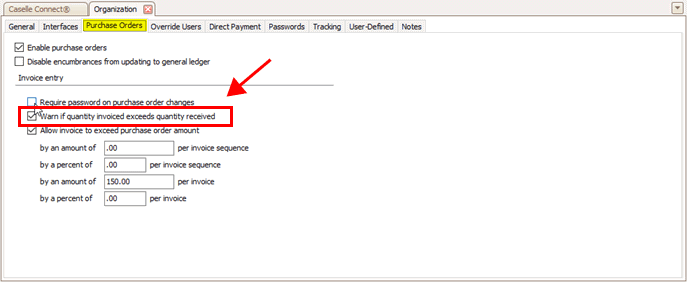 I want to display a warning on the screen. On the Purchase Orders tab, click to select Warn If Quantity Invoice Exceeds Quantity Received.