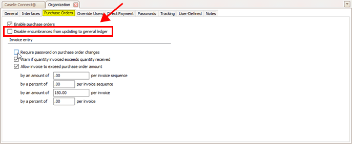 Purchase Orders tab, Disable encumbrances from updating to general ledger
