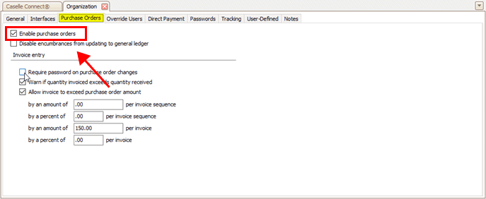The options on the Purchase Orders tab will only be available if you have purchased the Connect Purchase Order and Requisitions application. To purchase the PO and Requisitions module, contact a client relationship manager at (800) 228-9851.