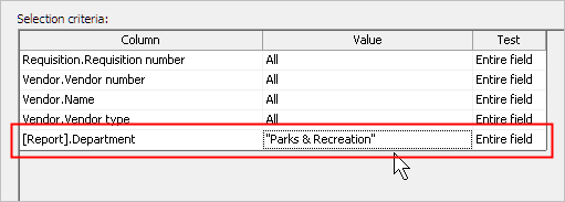Add the [Report].Department column to the Selection Criteria and then set the value to the department name. Only the requisitions for the selected department will be included on the report.