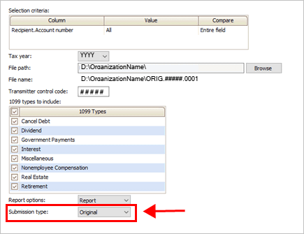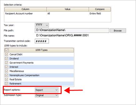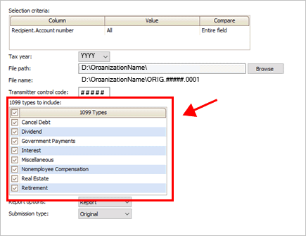 5. Use the 1099 Types to Include box to select the 1099 types to include in the electronic file.