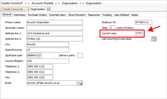 The next step is to change the current year in the Accounts Payable application to the new tax year. How do I change the current year? 1. Open Connect Accounts Payable > Organization > Organization. 2. Use the Current Year box to enter the new tax ...