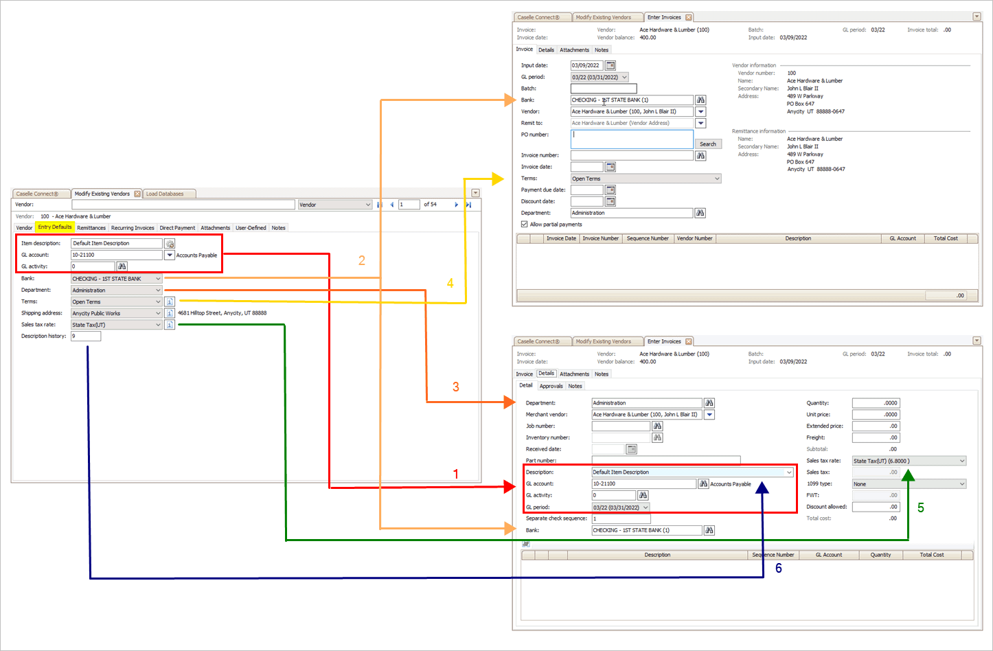 To make filling in the invoice faster, you can set up the default values for a vendor. The default values allow you to choose what to enter in the following fields: item description, GL account, GL activity, bank, department, terms, shipping address, sales tax rate, and description history. When you enter a value as an entry default, it will show up as the default value in the corresponding field when you use the vendor to enter an invoice, purchase order, or requisition.