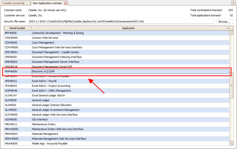 2. Scroll through the list of application licenses until you find PRM4#### Electronic W2/1099.