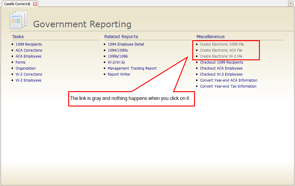 If you have purchased a license for Electronic W-2/1099, but the link is grayed out and you can't click on it, then you may need to update the user permissions to grant access to the user to launch the Electronic W-2/1099 module. This is what it looks like when you run Government Reporting from Connect Payroll.