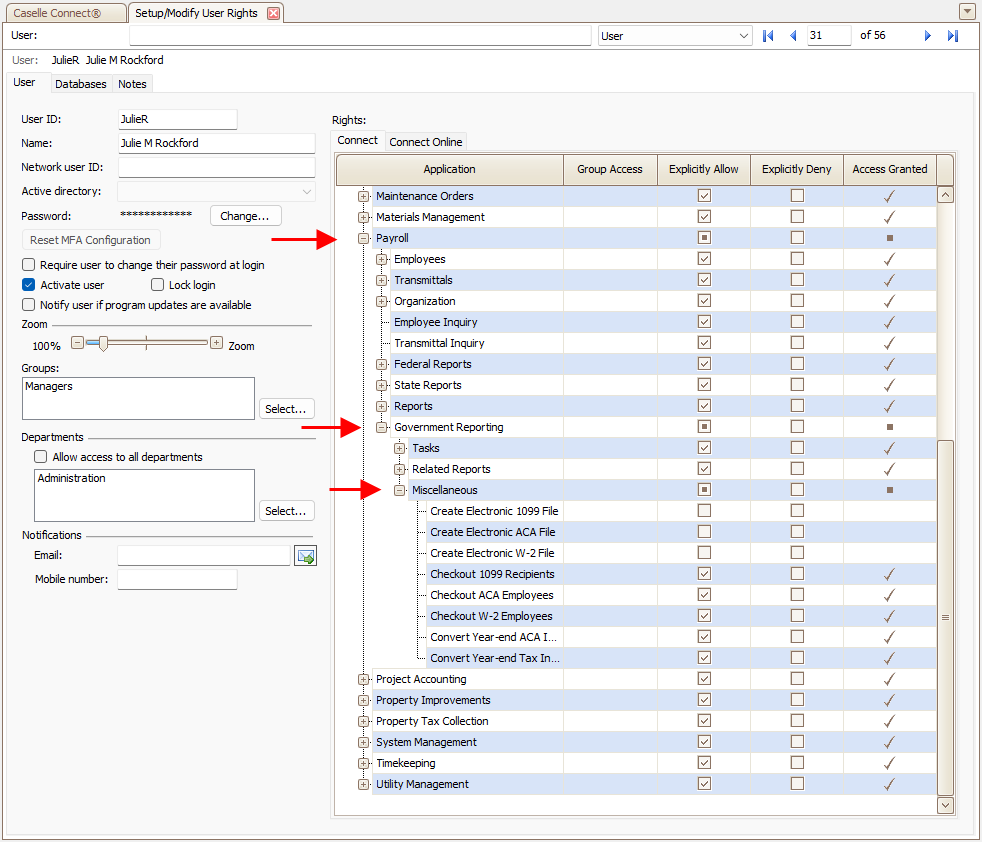 To fix this issue, you will need to update the user rights to allow the user to access the Electronic W-2/1099 module. You may need to contact the application manager or IT manager for assistance. Open Connect System Management > Security, and then select Setup/Modify User Rights. Look up the user. In the Rights pane, navigate to Payroll > Government Reporting > Miscellaneous.