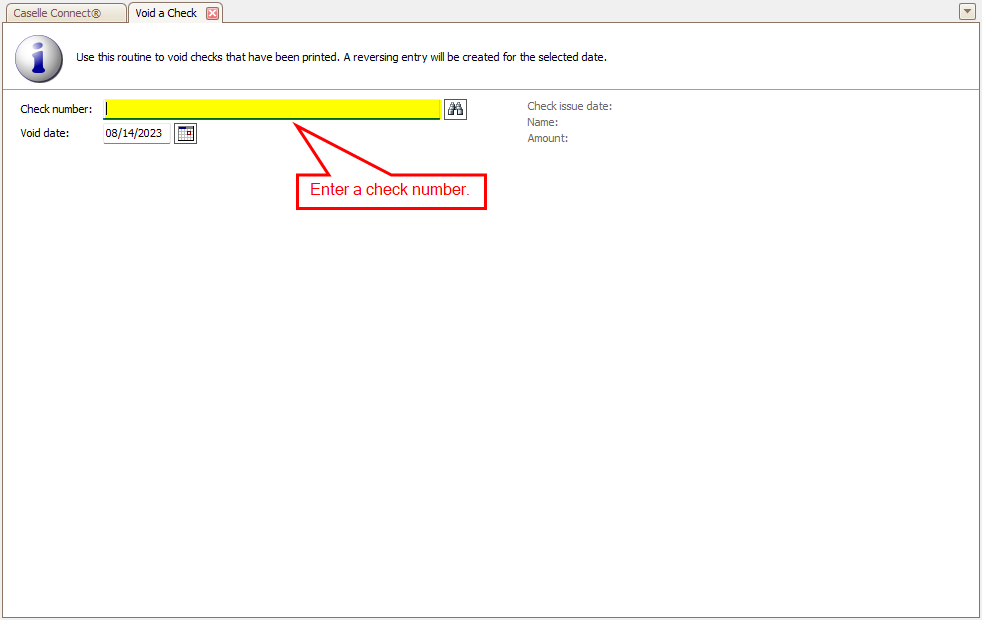 This is the check number for the check that you will void. Click Search to look up a check number using the check issue date or payee name.