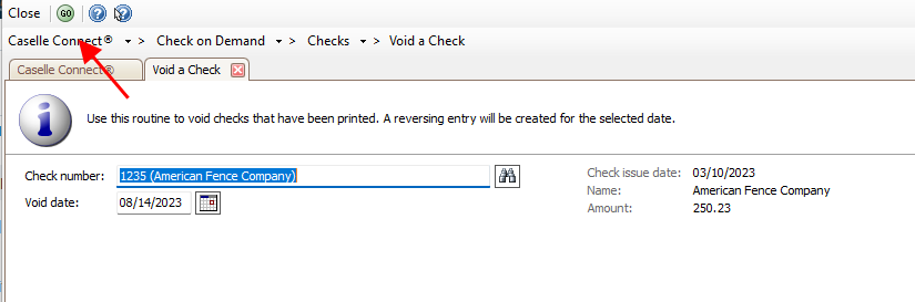 1. Open Connect Check on Demand > Checks > Void a Check.