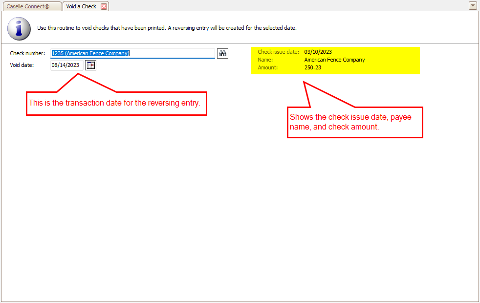 When you void a check that has already been printed, Connect will create a reversing entry on the current date. If the check has NOT been printed, use the Void and Reset option in the Print Checks report.