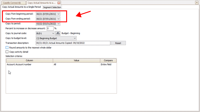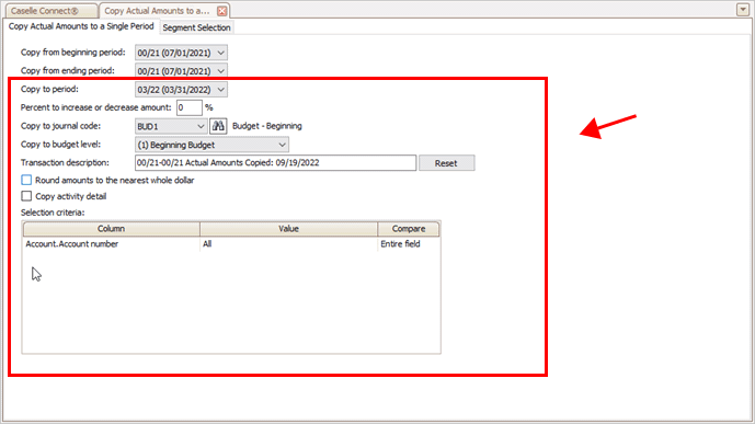 1. Open Connect General Ledger > Budgeting > Copy Actual Amounts to a Single Period.
