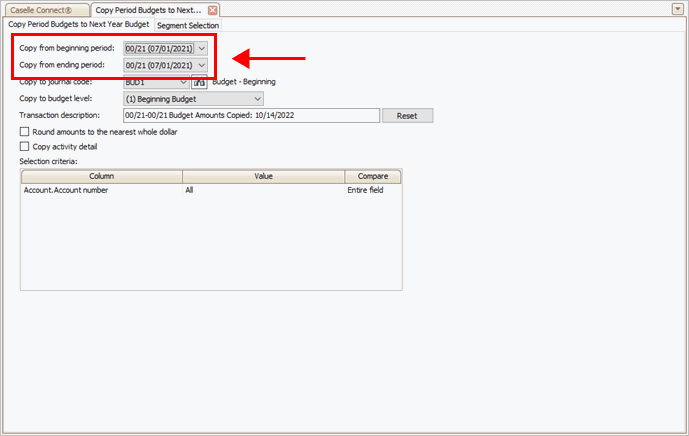 2. Enter the Copy from Beginning Period and Copy from Ending Period.