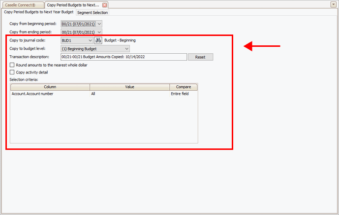 1. Open Connect General Ledger > Budgeting > Copy Period Budgets to Next Year Budget.