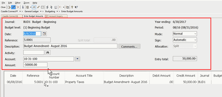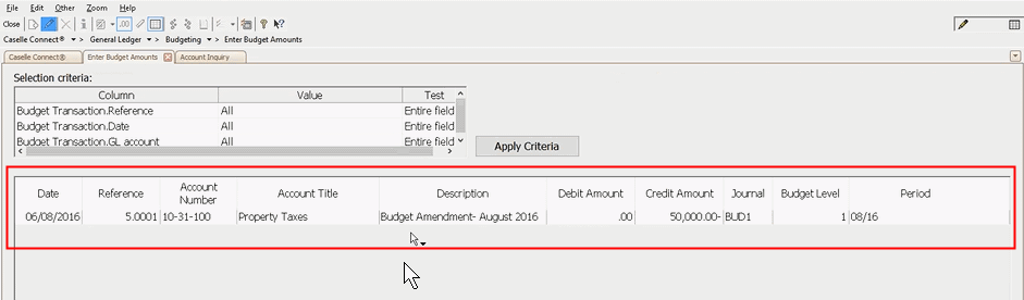 All of the budget entries that you have created during the current session display in the transaction grid at the bottom of the screen.