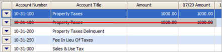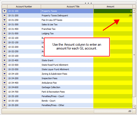If you're entering amounts for a single period, use the Amount column to enter an amount for each GL account. Click on box and then type in an amount.