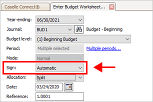 Use Automatic to look at the sign that is normally associated with the GL account and then use the appropriate sign to create a debit transaction or credit transaction. For example, Jane wants to enter all budget amounts as positive amounts. She selects Automatic as the Sign. When she enters a budget amount, Connect looks at the sign on the GL account. If GL account has a normal balance of credit, Connect changes the sign on the amount to show credit. On the other hand, if the GL account has a normal balance of debit, Connect will change the sign on the budget amount to debit.