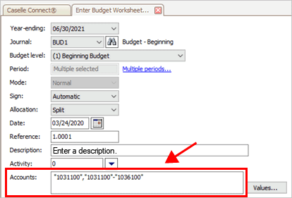 Enter the GL accounts to include on the worksheet. You will need to enter a quotation mark before and after each GL account. Press the (+) key on the keyboard to enter the previous value.