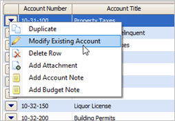 Look up the account to make changes to the account properties. Using this option will show the account in Modify Existing Accounts. For example, changing the account properties to allow budget amounts, viewing account notes, viewing budget notes, and so on.