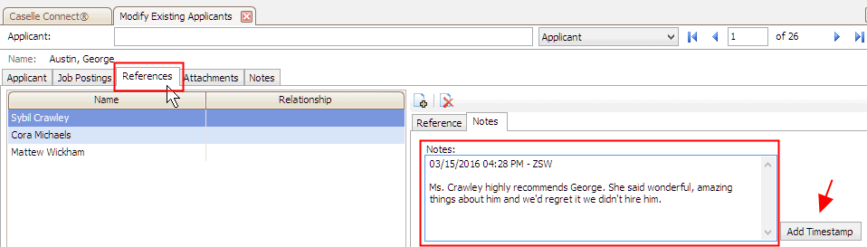 After you contact a reference, you can use the Notes tab to add the reference's comments, observations, and recommendations.