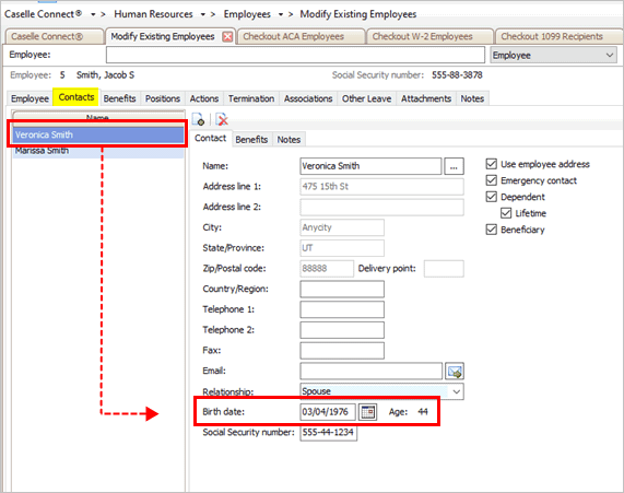 Add a Social Security number to a contact who is listed as a dependent. Adding a birth date to a dependent 1. Open Connect Human Resources > Employees > Modify Existing Employees. 2. Click the Contacts tab. 3. Select a dependent from the Name grid. ...
