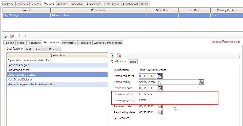 The qualifications that you add to the employee's record will only apply to the selected employee. It will not apply to other employees who have been assigned to the same position unless you add the qualification to the position in the Positions ...