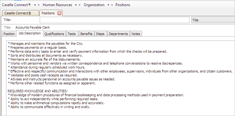 Use Human Resources to add, edit, and delete the positions in organization. When an employee fills the position, Human Resources will assign the position's job description, qualifications, tests, benefits, steps, and departments to the employee record.