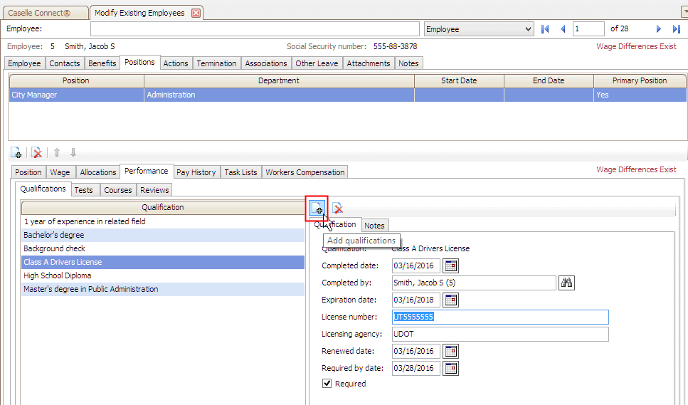 When you add a qualification to an employee's position, you can add important dates such as the completed date, expiration date, renewed date, and required by date. Do this... 1. Open Connect Human Resources > Employees > Modify Existing Employees. ...