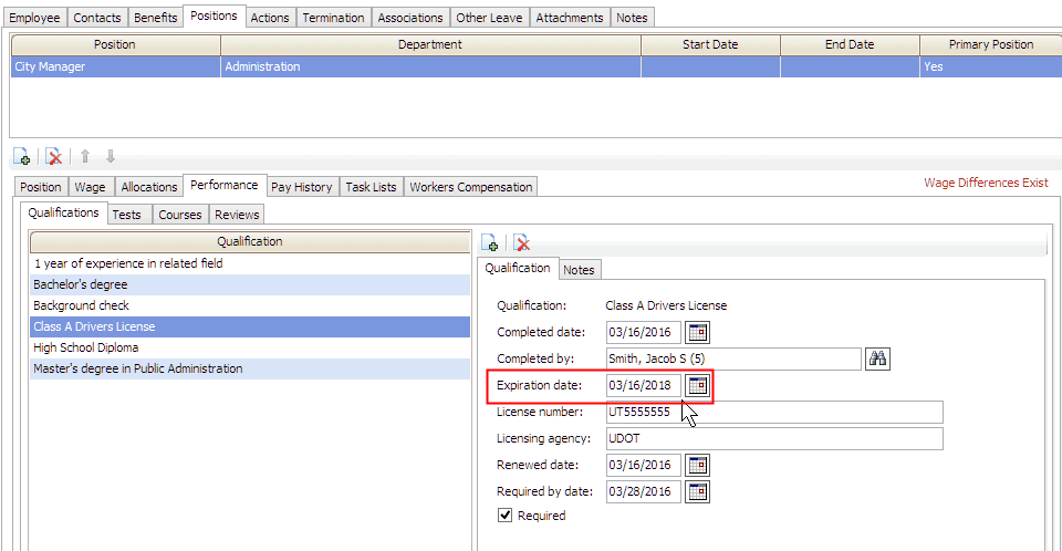 When you add a qualification to an employee's position, you can add important dates such as the completed date, expiration date, renewed date, and required by date. Do this... 1. Open Connect Human Resources > Employees > Modify Existing Employees. ...