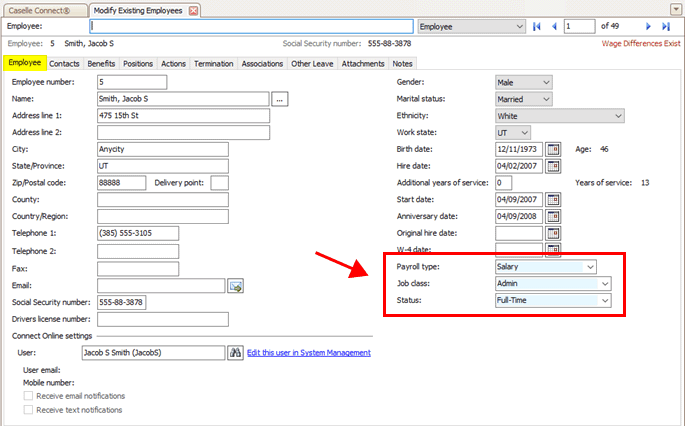 See the new Payroll Type, Job Class, and Status boxes that have been added to the Modify Existing Employees view in the Human Resources application. Making updates to this information in the Human Resources application will also update the information that displays in the Payroll application.