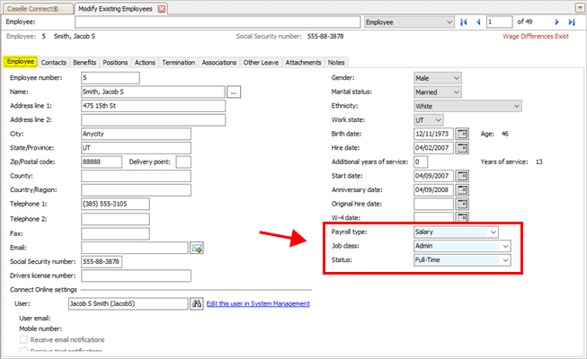 Payroll type, Job class, and Status boxes in Modify Existing Employees
