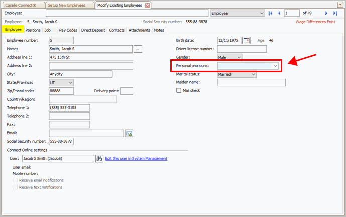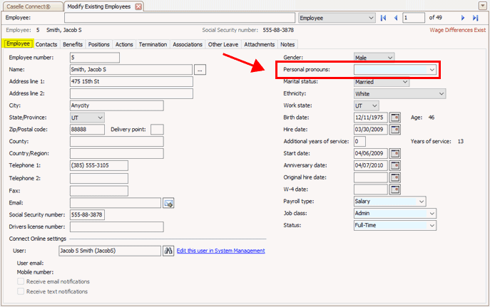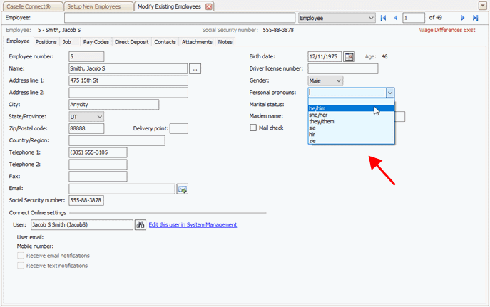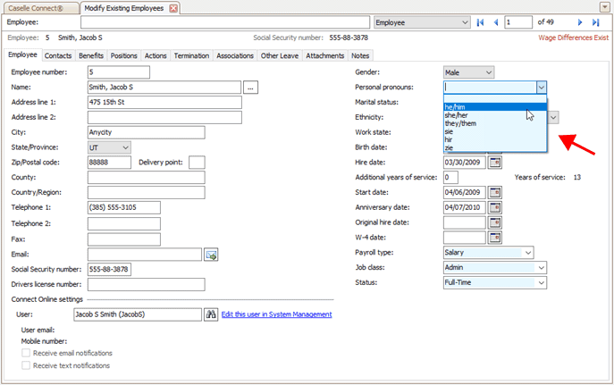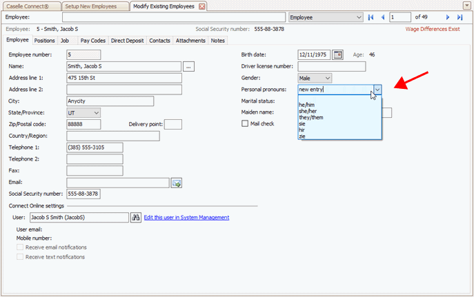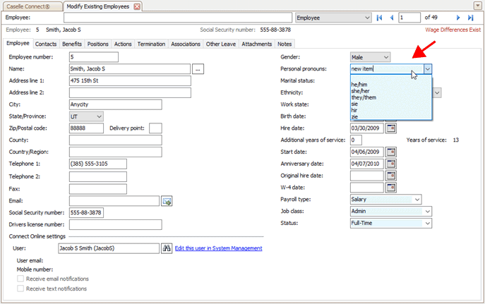 Payroll, Modify Existing Employees - Personal pronouns, new entry