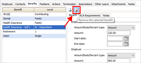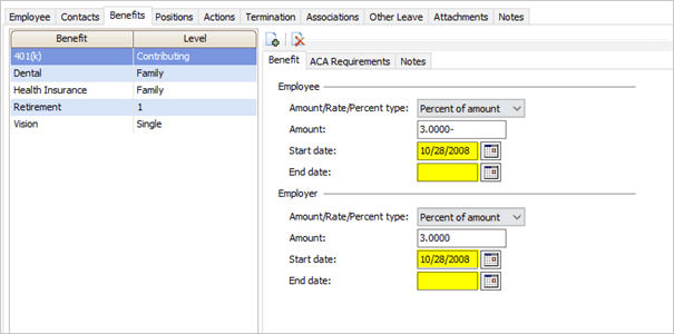 Use the start and end date to calculate the employee benefit for date range. You can add a start date, end date, or add both a start and end date. The employee benefit properties shows separate start/end dates for the employee portion and the employer portion.