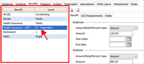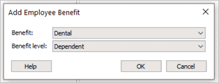 4. Use the Add Employee Benefit window to select a benefit and benefit level, and then click OK.