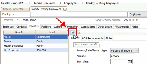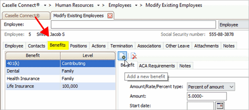 A benefit is money that is paid by the organization to an employee. Use the Benefits tab to assign benefits to an employee. Do this... 1. Open Connect Human Resources > Employees > Modify Existing Employees. 2. Use the Employee field to enter an ...