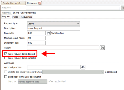 Change the options on a request so the employee who submitted the request can also delete the request. If this option is not selected, only the manager can delete the employee's request. Deleting a request will remove the request from the approval process and delete it from the employee's request history.