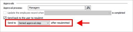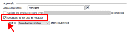 Use this option to return a denied request to an employee. This option allows an employee to review the denied request, make changes to the denied request, and then resubmit it for approval. If you use this option, you can decide which approval step will be assigned to the denied request when it is returned to the employee.