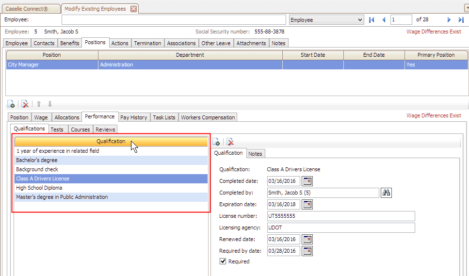 Human Resources lists all of the qualifications assigned to a position in the employee's record. Human Resources will display all of the qualifications that are attached to the position in the Positions table. You can customize the qualifications assigned to the employee filling the position. The updated qualification list will be saved as part of the employee's record and none of the changes you make to an employee's record will affect the qualification list attached to the position in the Positions table.