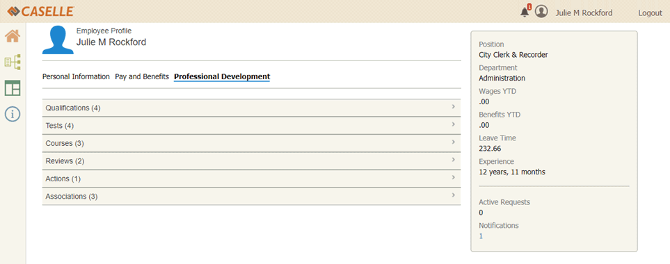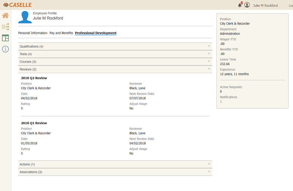 Review your qualifications, tests, courses, reviews, actions, and associations. Make sure the information is up to date and correct. If you find the information is not correct, contact your manager or HR manager.