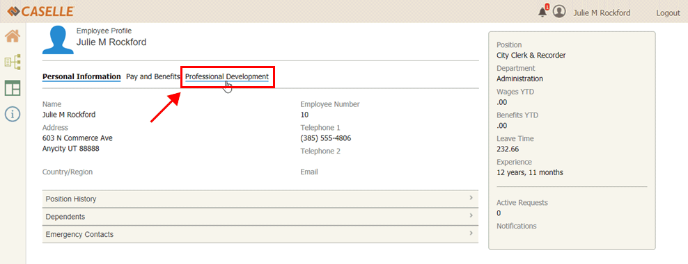 The Professional Development page displays your qualifications, tests, courses, reviews, actions, and associations.