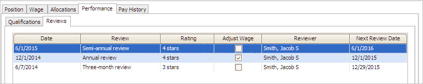 A performance review saves the review date, review type, rating, reviewer's name, and next review date. If the performance review justifies a wage adjustment, there's a checkbox to record it however, it will not adjust the wage for you. You will need ...
