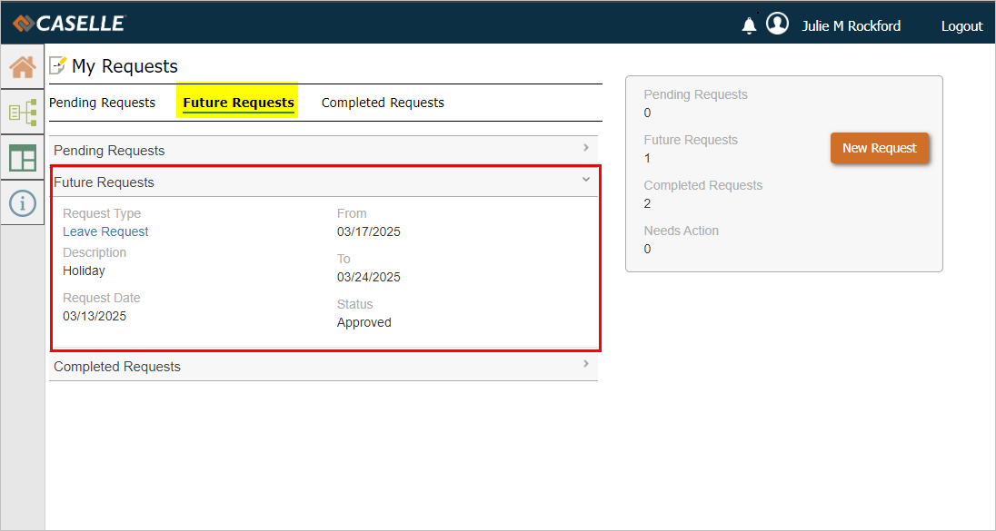 My Requests page: When you're working in the My Requests page, click to select Future Requests, and then expand the Future Requests section. The Future Requests section will show leave requests that are coming up.
