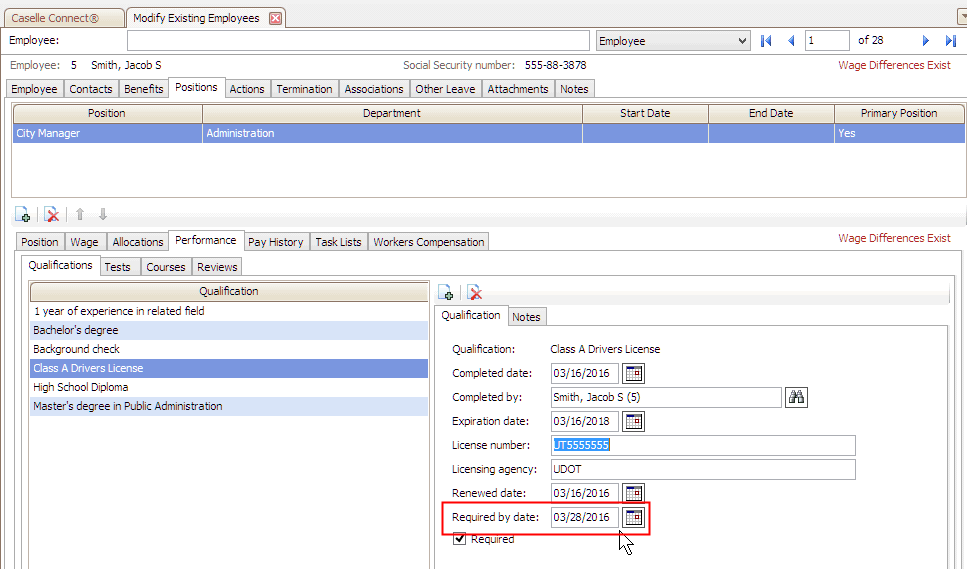 When you add a qualification to an employee's position, you can add important dates such as the completed date, expiration date, renewed date, and required by date. Do this... 1. Open Connect Human Resources > Employees > Modify Existing Employees. ...