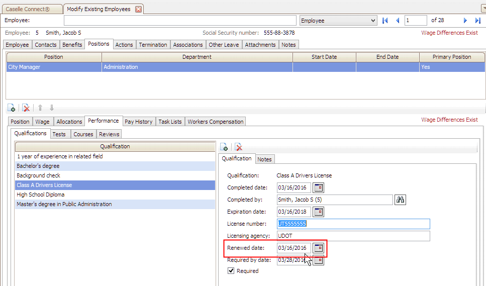 When you add a qualification to an employee's position, you can add important dates such as the completed date, expiration date, renewed date, and required by date. Do this... 1. Open Connect Human Resources > Employees > Modify Existing Employees. ...