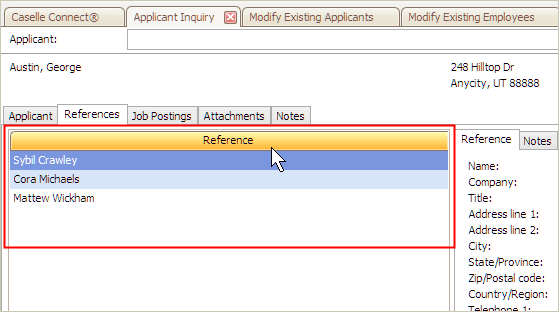 Use Applicant Inquiry to view the references in an applicant's file. To add a reference to an applicant's file, see the help topic titled How do I add a reference?