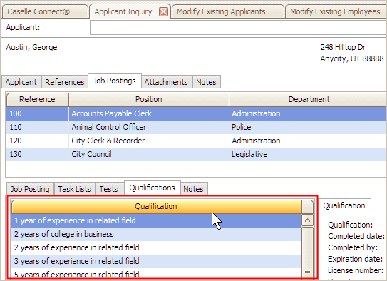 Save the qualifications an applicant can use to fill a job posting. Adding qualifications 1. Open Connect Human Resources > Applicants > Modify Existing Applicants. 2. Use the Applicant field to enter an applicant name. Press Enter. 3. Click to ...